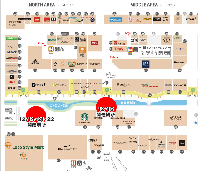 那須ガーデンアウトレット 特設スペース 【住所】 【開催場所について】 開催場所は那須ガーデンアウトレットの特設スペースとなります。開催日によって場所が異なります。 下記地図内の赤丸の場所での開催となりますので、お間違いないようご来場ください。 ![]() 12/14・21・22開催場所(じゃぶじゃぶ池) 12/15開催場所(ゲートB) |